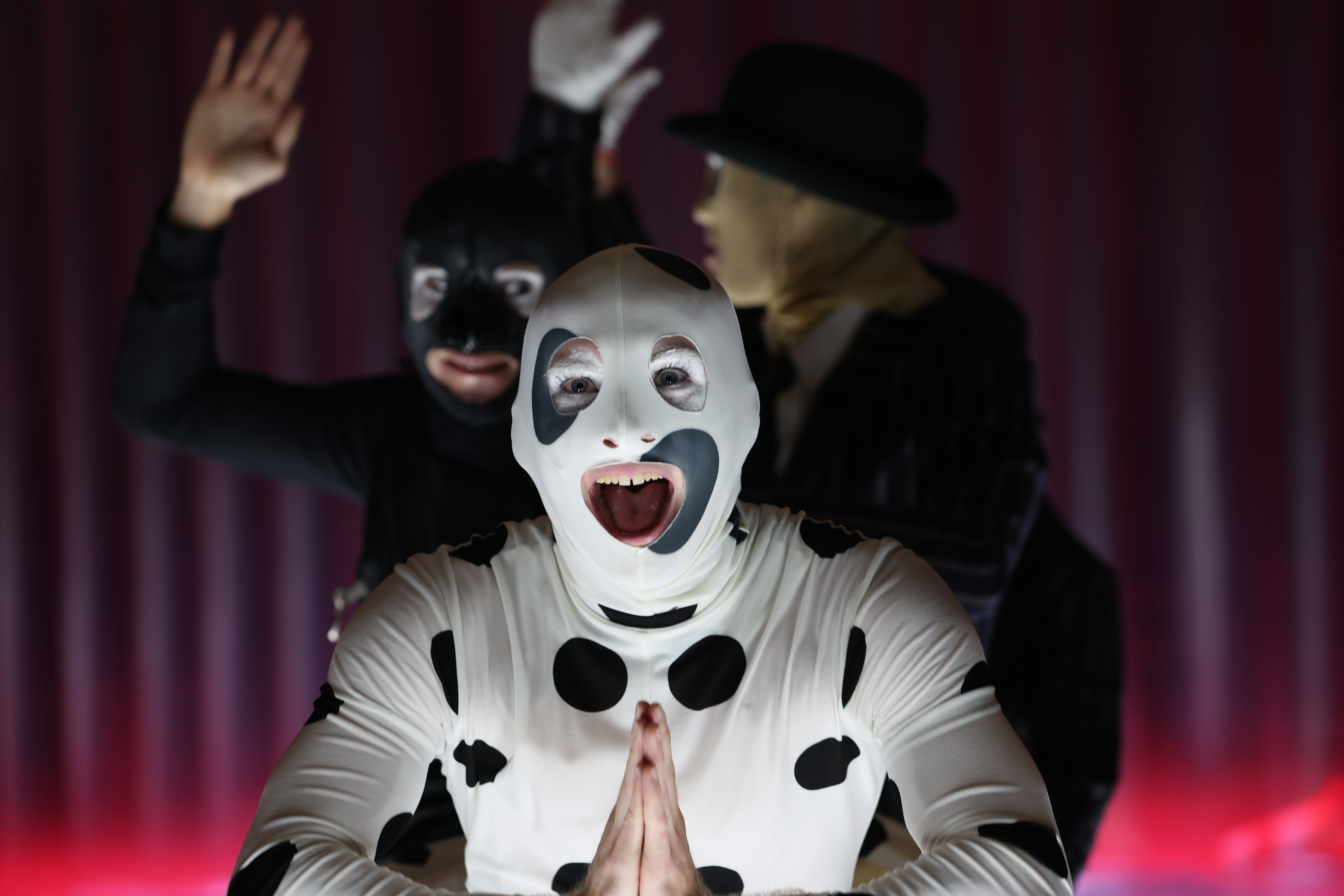 Kui ruum ise on askeetlik, siis tõuseb lavastuse keskseks väljendusvahendiks just Semperi eklektiline kostüümidisain. Juhmardiinid kõvakübarate ja vaudeville’i stiilis ülikondades, millel kahe jala vahel töllerdab rekvisiidist pea; liibuvad, BDSM-i esteetikale rõhuvad kostüümid ja psühhedeelselt ornamentaalsed lillemustrid pakuvad ääretult lustliku tahu kogu lavastusele. Esimese vaatuse lõpuni on etendajate näod peidetud fantasmagoorsete maskide taha ning keeruline on nime ja karakterit kokku panna. Seega ei saa, ei peaks ega hakkagi tudengite sooritust selles kontekstis üldse hindama.