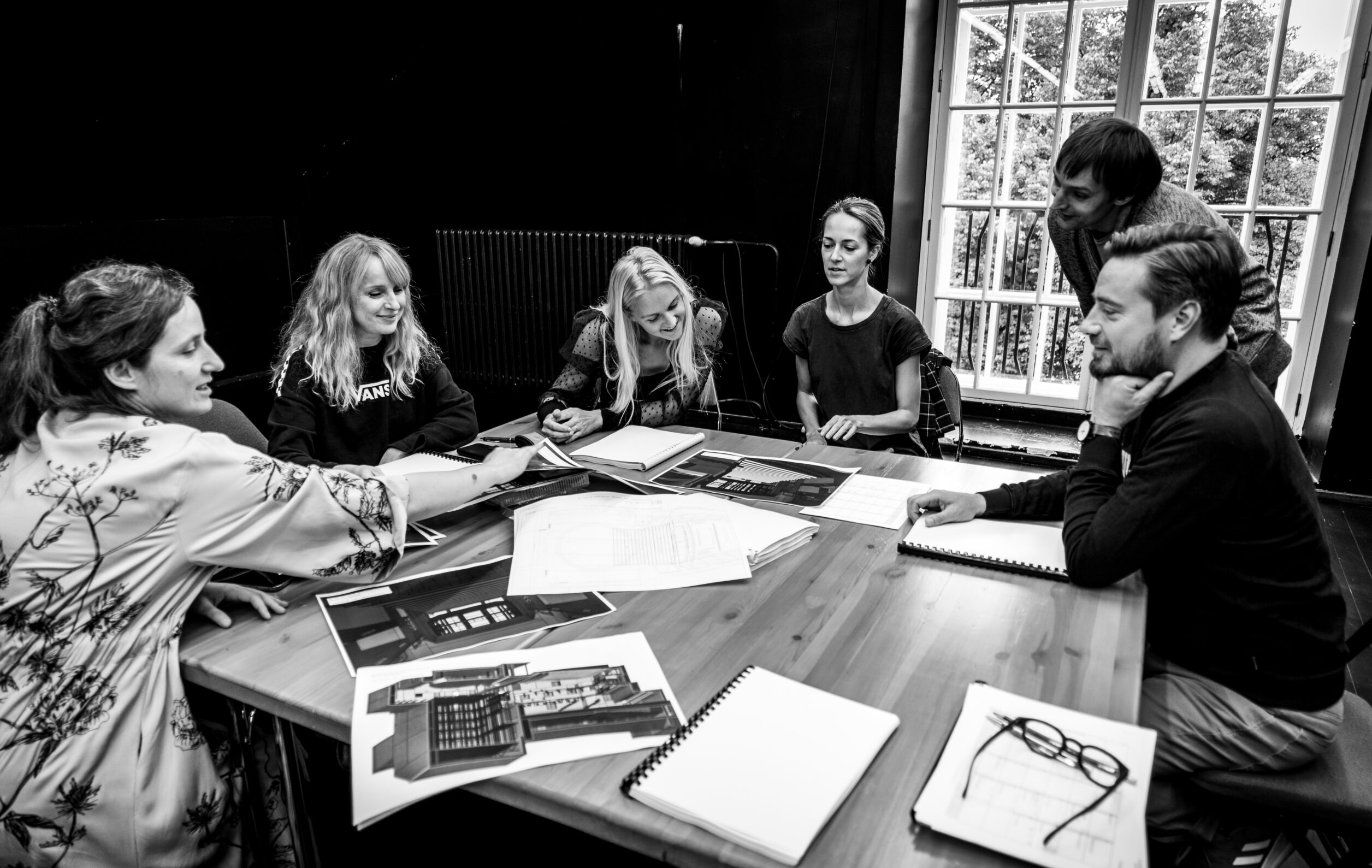 Lavastuse kunstnik Kairi Mändla, näitlejad Hilje Murel, Helena Lotman ja Inga Salurand, dramaturg Paavo Piik, lavastaja Priit Võigemast tutvumas lavakujundusega. Foto: Kadri Hallik