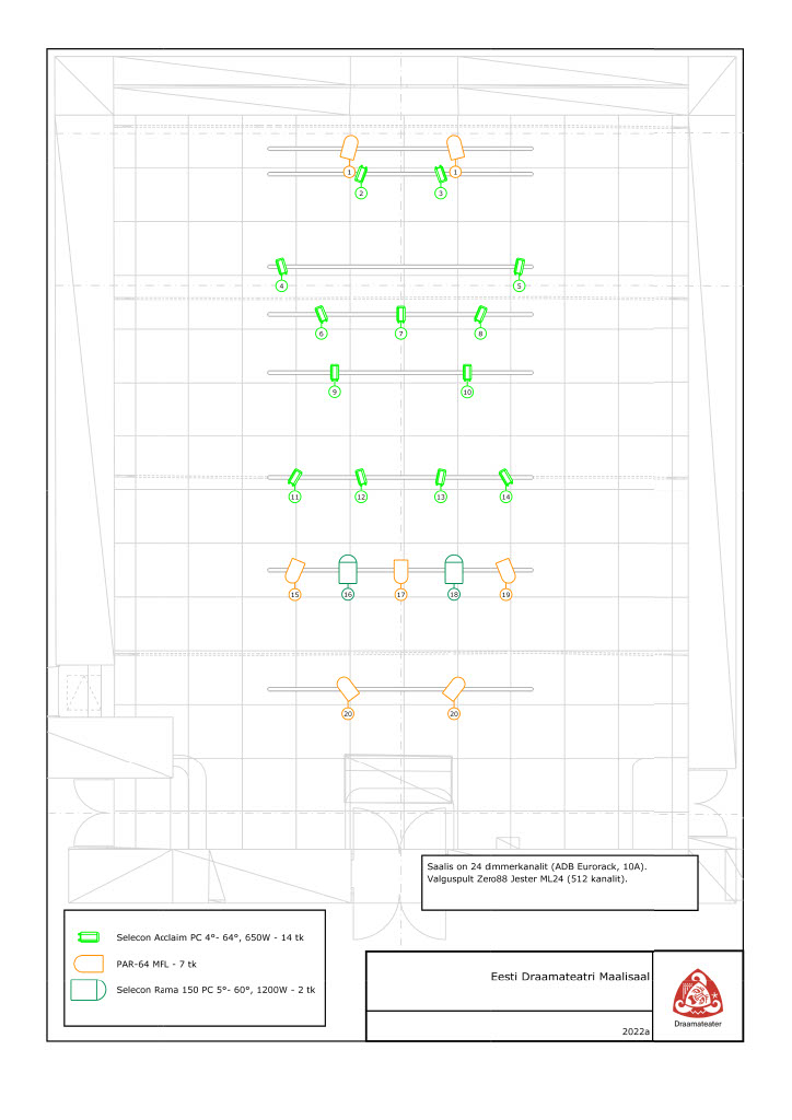 Saal: Parteri külgedel ja I rõdul on seinte õõnsustes EV EVID seeria kõlarid.