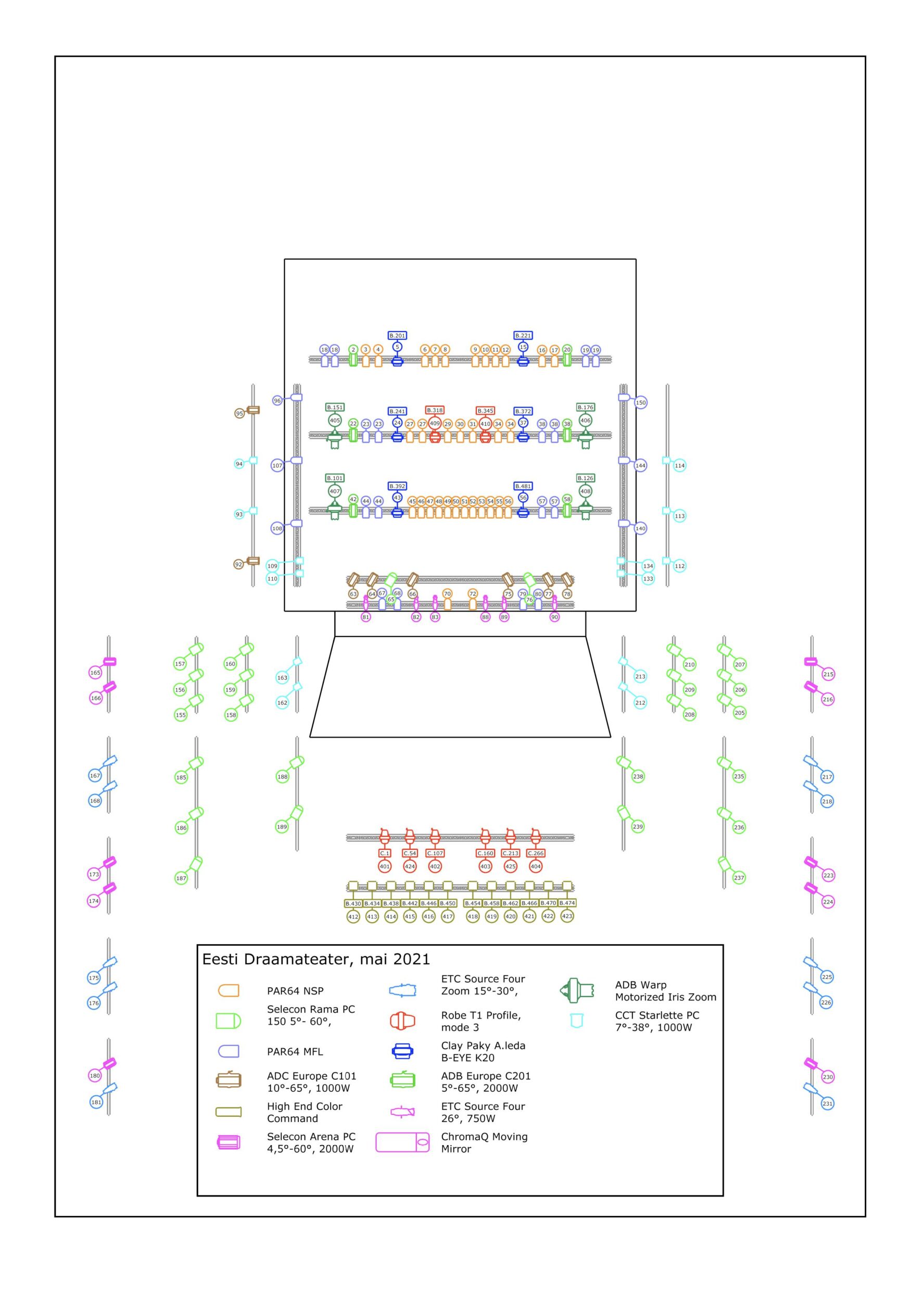 Stereo PA: 4x K-Array KK200 (parter ja I rõdu), 4x KK50 (katab II rõdu ja III rõdu) ja 3x K-Array KK200 center cluster. Lab Gruppen-i võimendid. Madalsageduskõlarid K-Array Ko30 (aktiivsed) on valgusloožides.